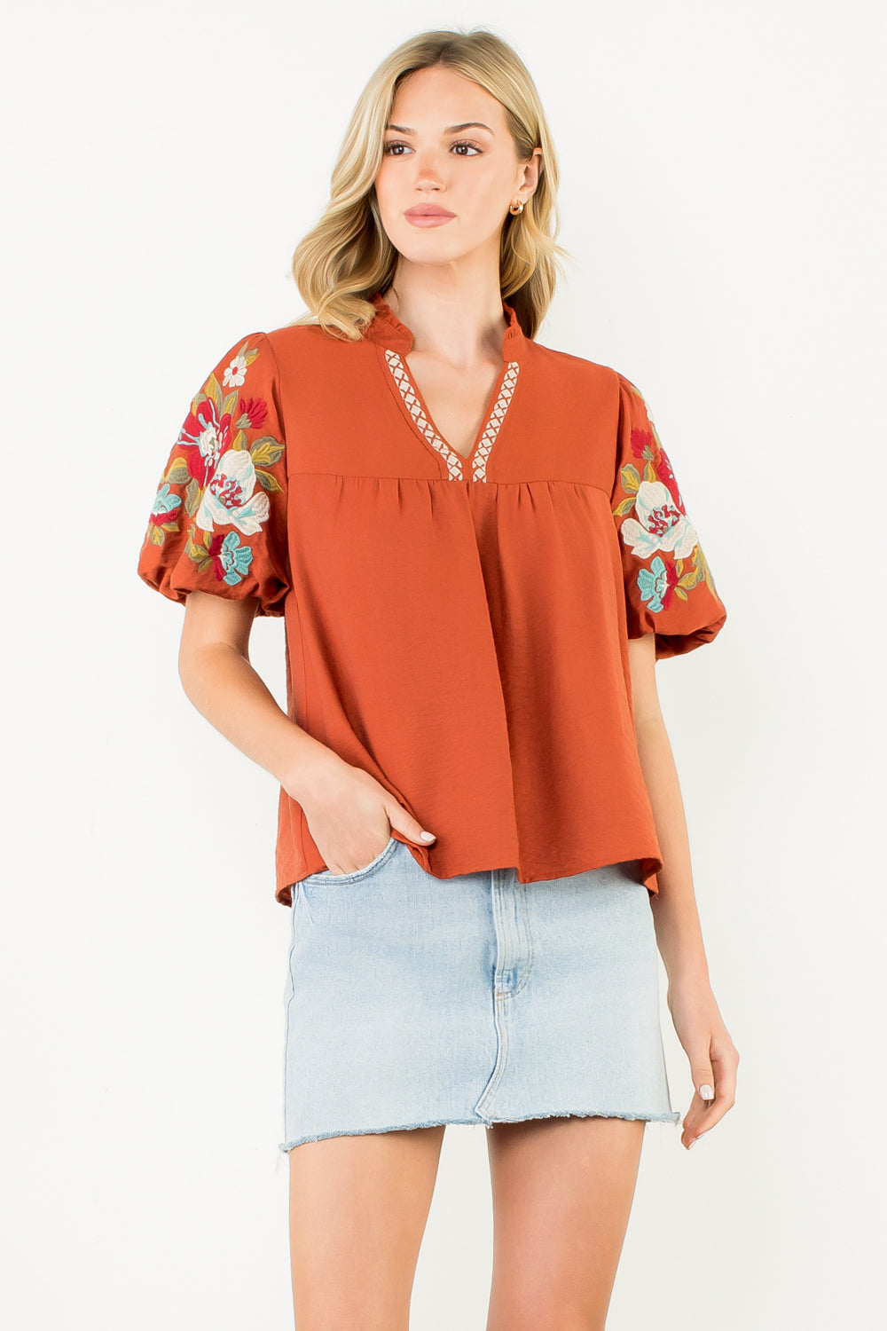 This V-neck top features intricate embroidery and stylish puff sleeves for a standout look. Designed in the USA, it offers a flattering fit with a body length of 35 inches, bust width of 38 inches, and sleeve length of 14 1/4 inches in size S. Elevate your wardrobe with this elegant and comfortable piece.