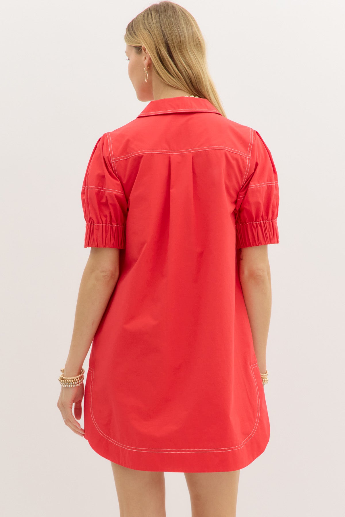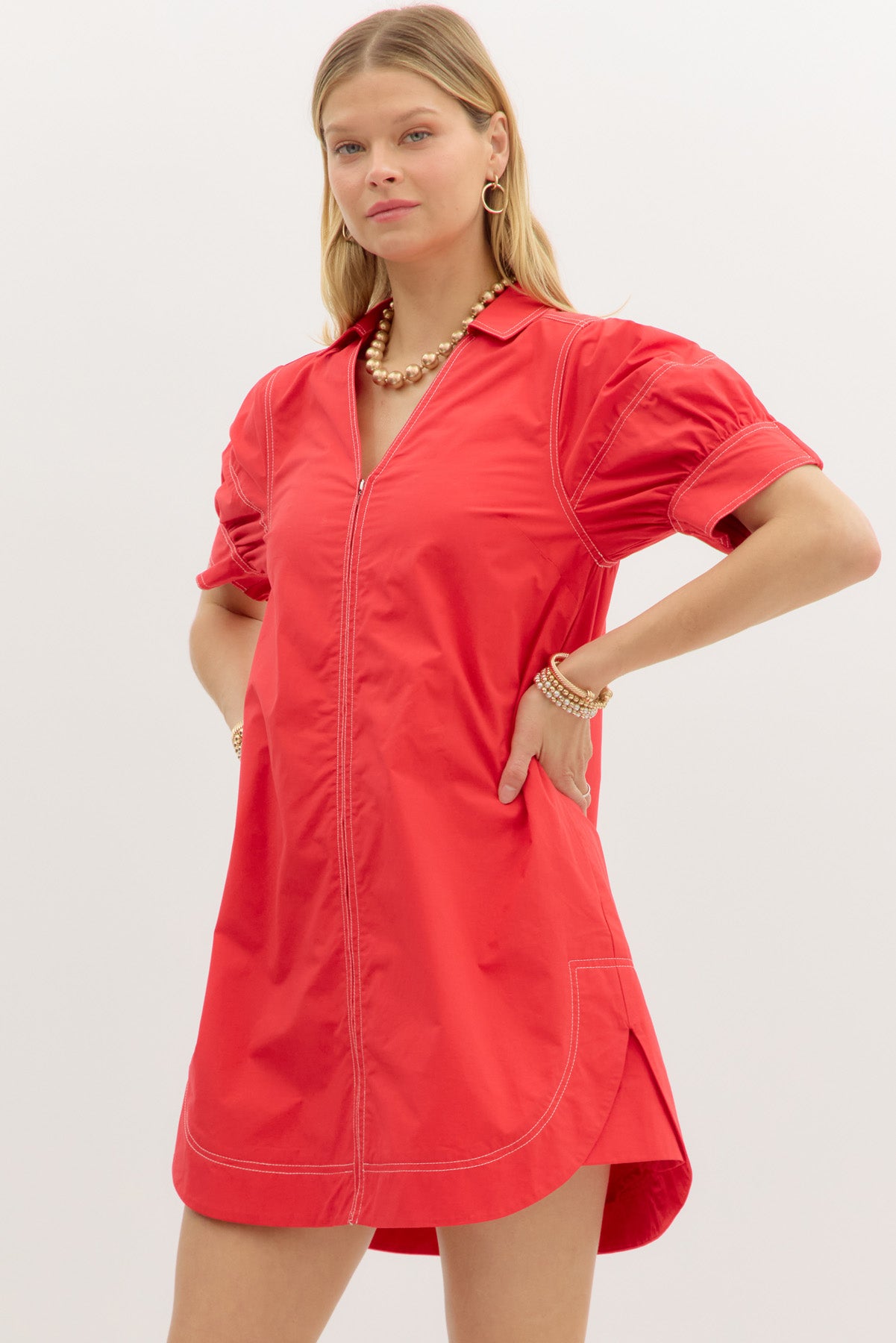 This black midi dress offers a fresh, modern twist on everyday style with bold contrast stitching that accentuates its sleek silhouette. Featuring cuffed short sleeves, a crisp V-neck collar, and a practical front zipper, it perfectly combines structure with comfort. Side pockets add a laid-back element, while the breathable 100% cotton fabric ensures comfort throughout the day. Effortlessly stylish and confidently minimal, this dress is ready to become your new favorite statement piece.