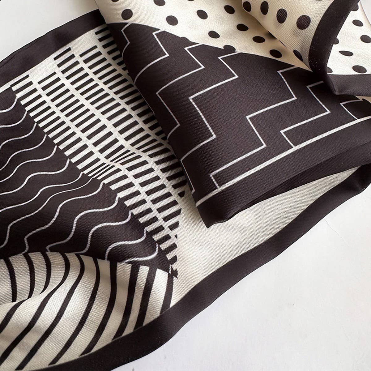 Geometric print chiffon neck scarf with a detachable pearl chain and magnetic clasp.