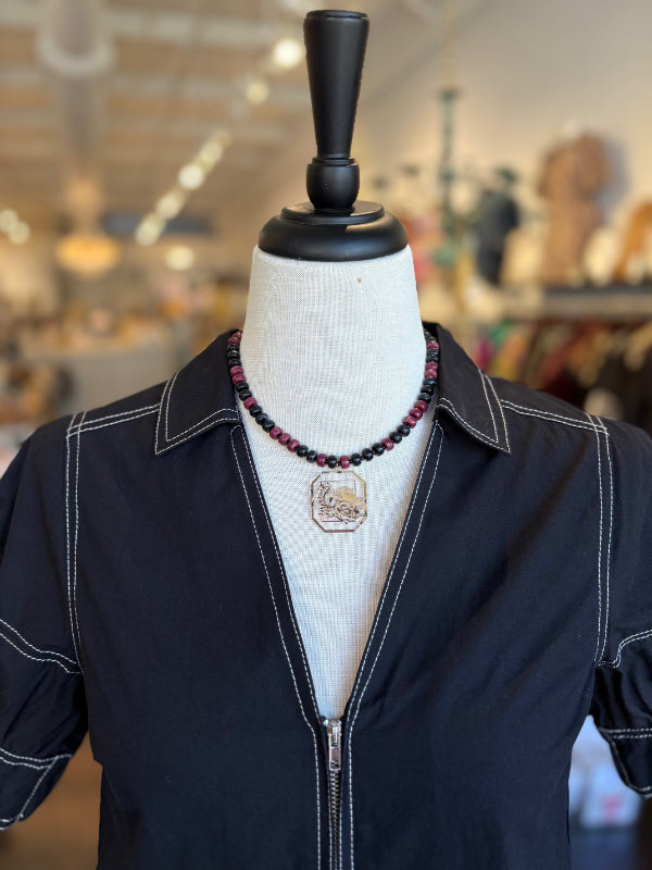 Elevate your game day look with the Ellison Stone Necklace in garnet and black. This stylish piece shines on its own or layered with other necklaces, making it a versatile accessory to showcase your team spirit with flair. Perfect for adding a fashionable touch to any outfit while celebrating your favorite colors. Dimensions: 15" with a 3" extender.