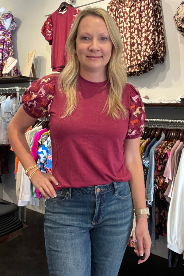 This top is adorned with a charming horse print, perfect for showing off your playful and unique style.