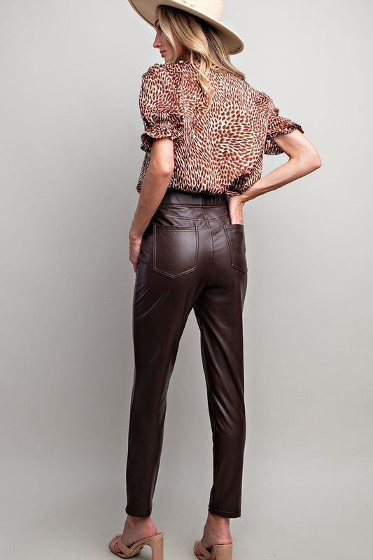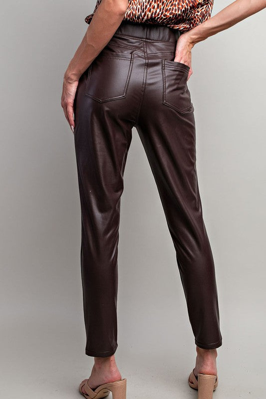 Faux leather leggings featuring a fitted jogger style leg, two back pockets, added seams for detail and a back elastic waistband.