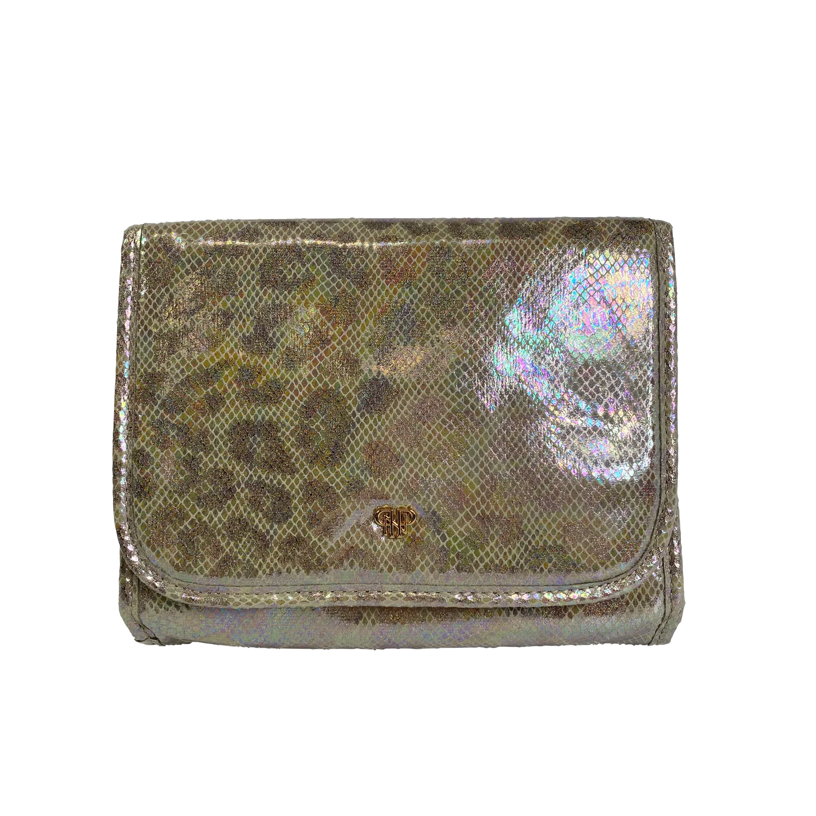 The Glimmer Leopard Getaway Toiletry Cas is perfect for travel and organization. Keep your toiletries organized and secure by packing them in our customer favorite classic toiletry case. The elegant folding design features 4 zippered pockets with a clear view design and a bottom pocket that includes a removable zipper pouch. The top folding hanger makes it easy to see and access your items no matter where you are.