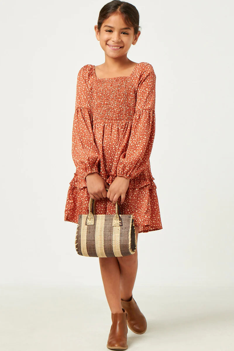 Girls Smocked Puff Sleeve Ruffled Dress