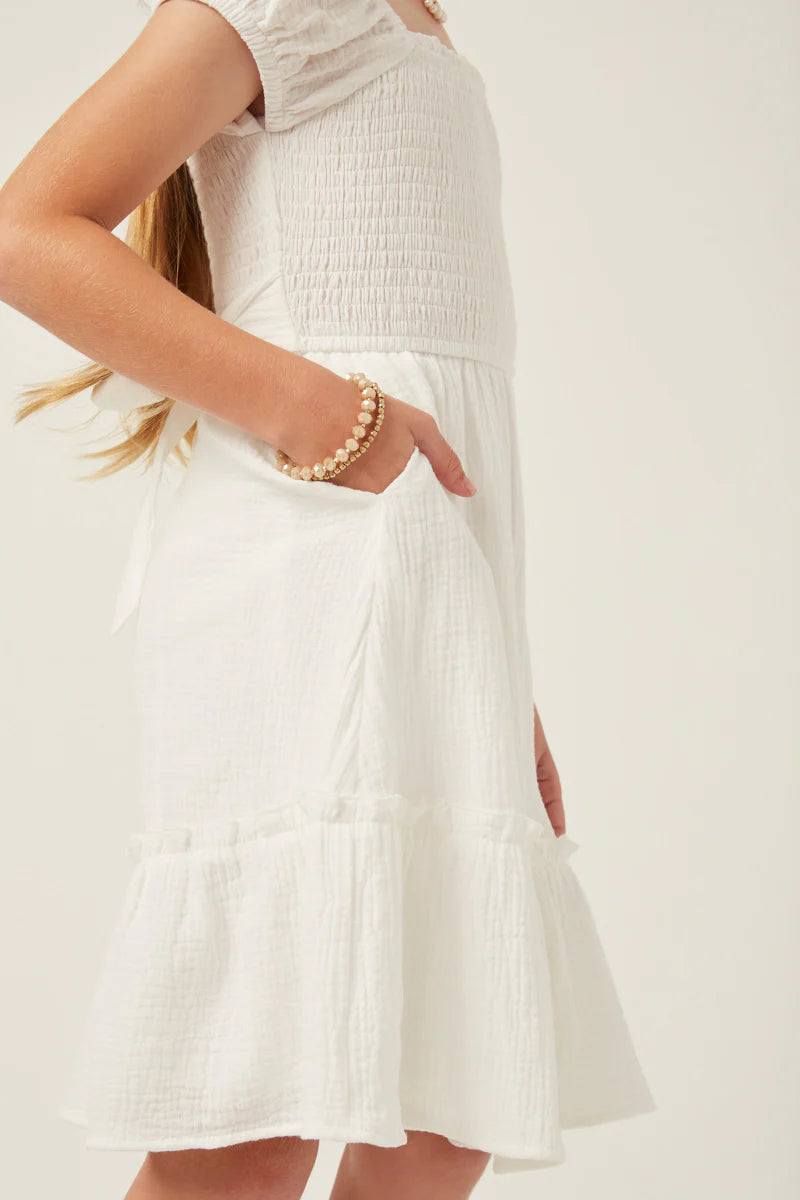 Girls Textured Puff Sleeve Smocked Squareneck Dress
