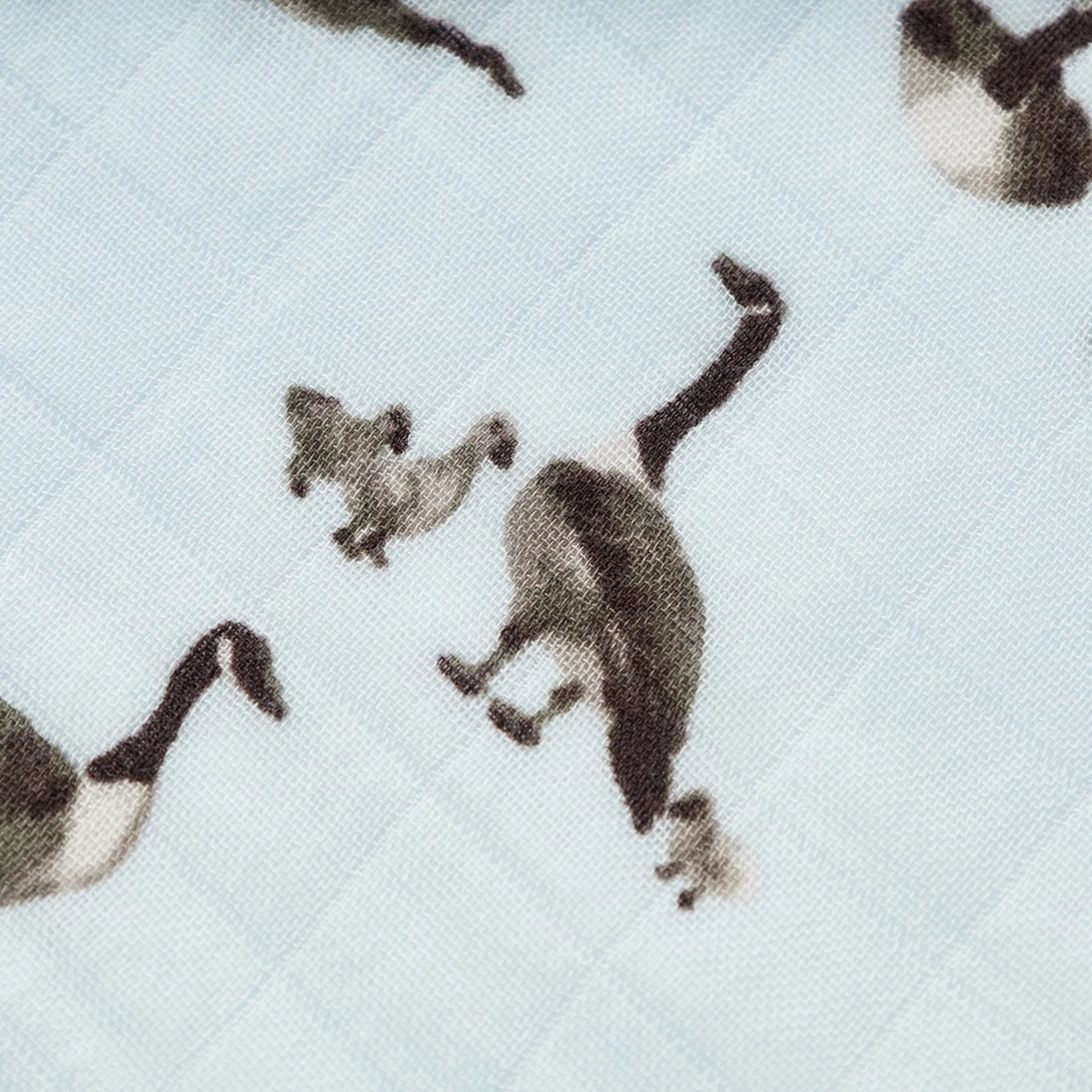 Our sumptuously soft and generously sized newborn and baby Bamboo Muslin Swaddle Blanket in the Goose print helps your little one feel safe and secure while being wrapped in smooth and gentle luxury.