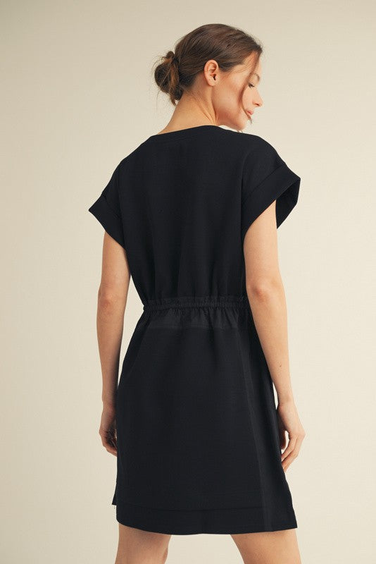This black jersey dress offers a chic U-neckline and an adjustable drawstring waist to tailor the fit just for you. Featuring short kimono sleeves, handy side pockets, and precise stitching, it blends elegance with everyday functionality. Crafted from lightweight, opaque fabric, it ensures all-day comfort and confidence.
