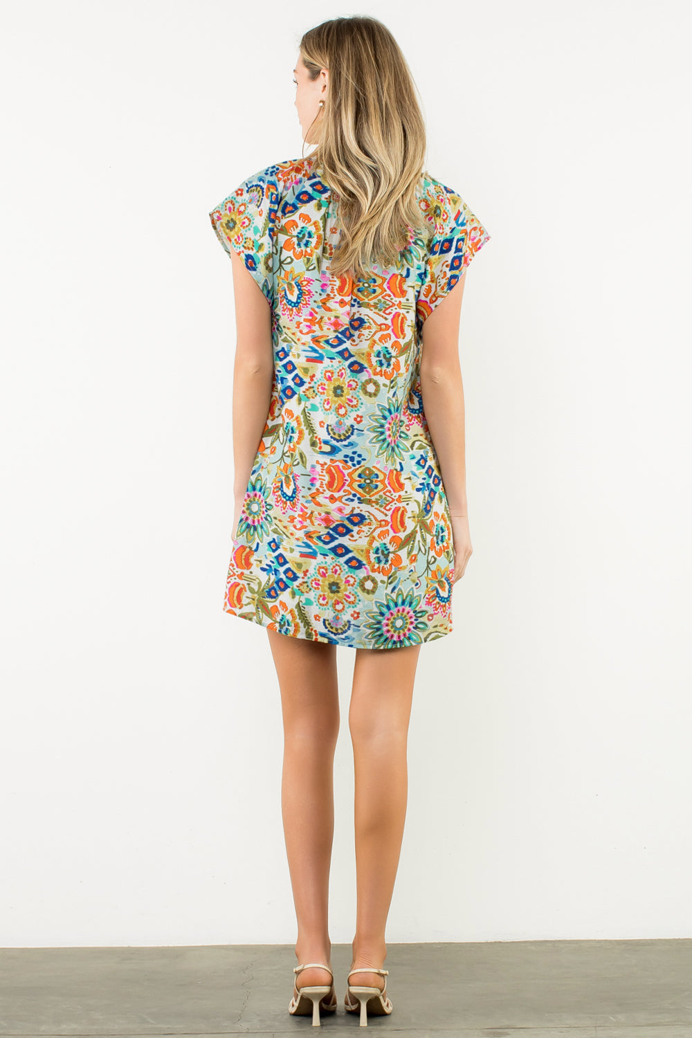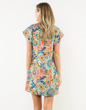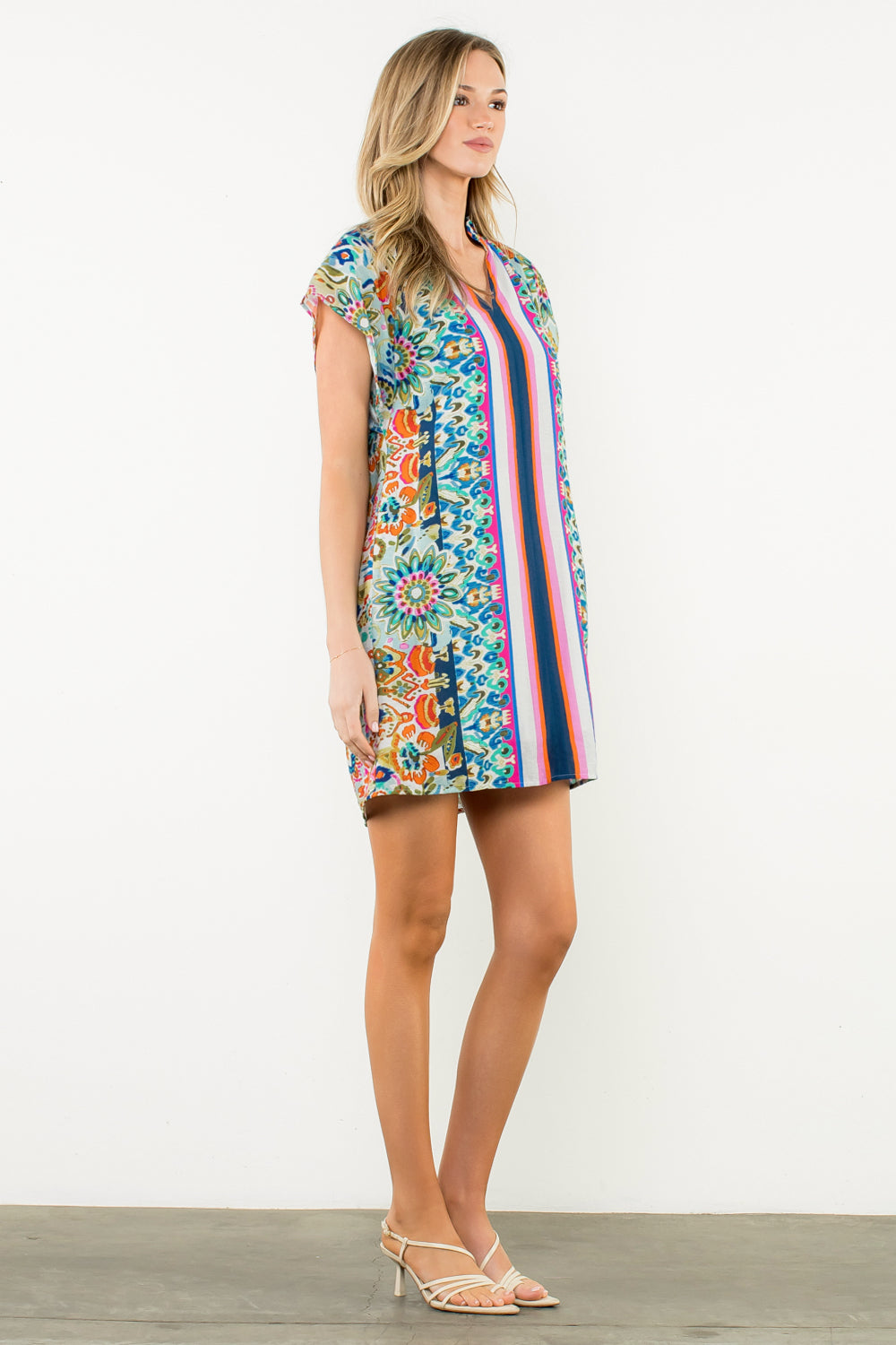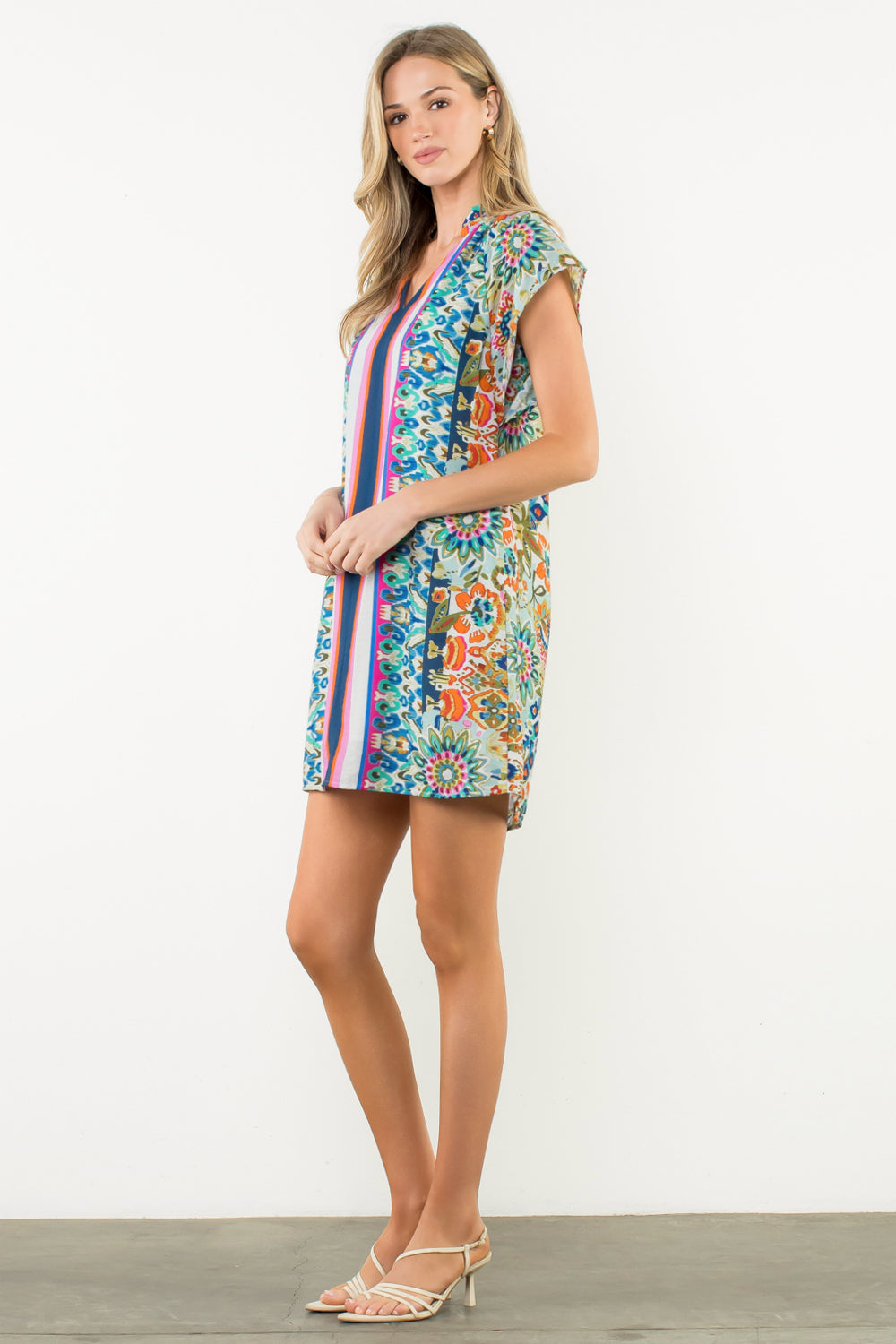 Infuse your wardrobe with vibrant color through the Jules Pop Shift Dress by THML. This lively short sleeve dress highlights a bold front stripe embellished with floral and geometric details, paired with a colorful all-over back print. Crafted with a relaxed fit, V-neckline, and lightweight fabric, it offers comfort from morning to night. Ideal for casual days, vacations, or brunch with friends, this dress delivers effortless style for sunny occasions.