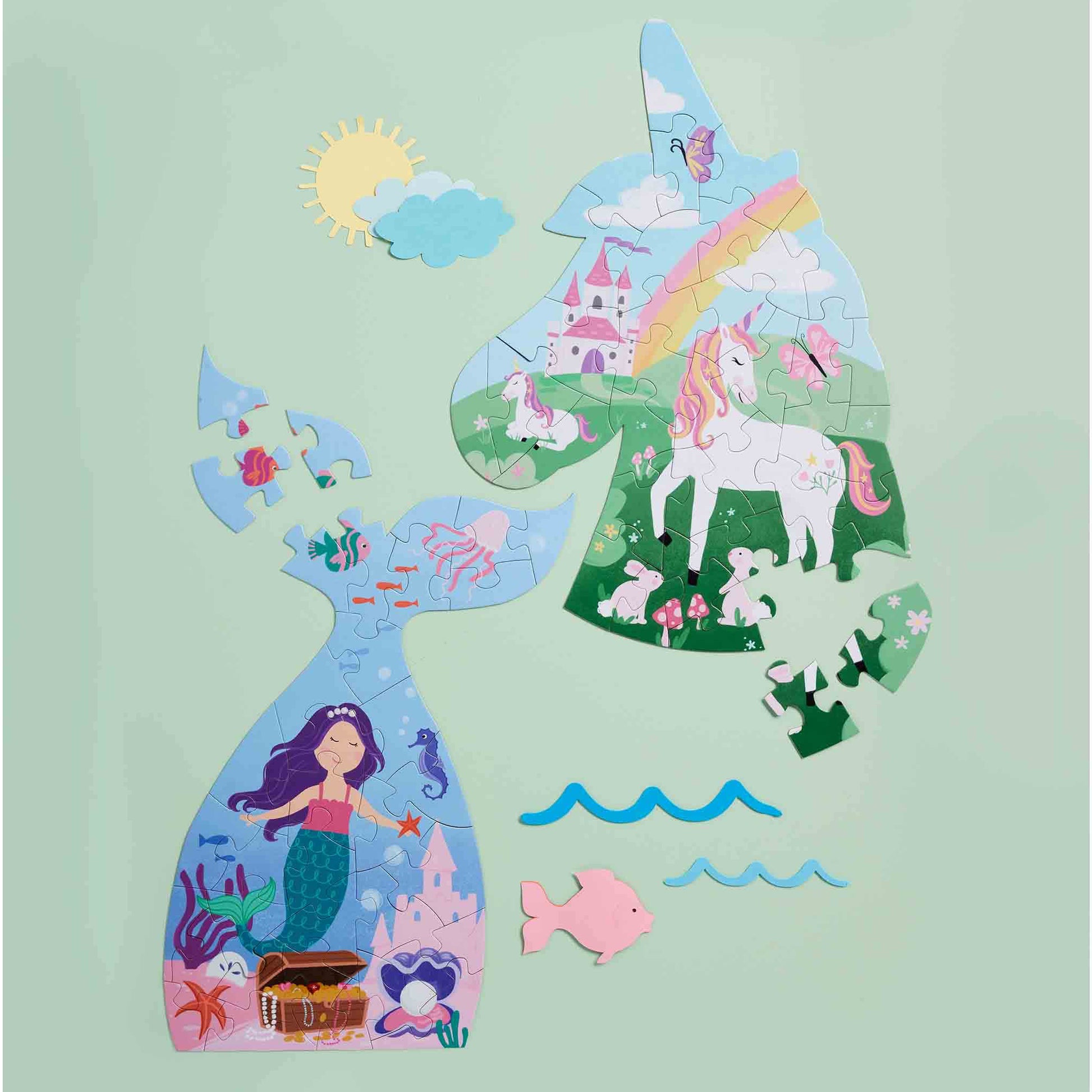 The Mermaid Shaped Floor Puzzle forms a familiar shape for floor puzzling fun! The 35-piece jumbo floor puzzle comes in a cardboard storage box. The box features a rope handle. The finished puzzle forms familiar shape that your little is sure to love. This puzzle is intended for children ages 3 and older.