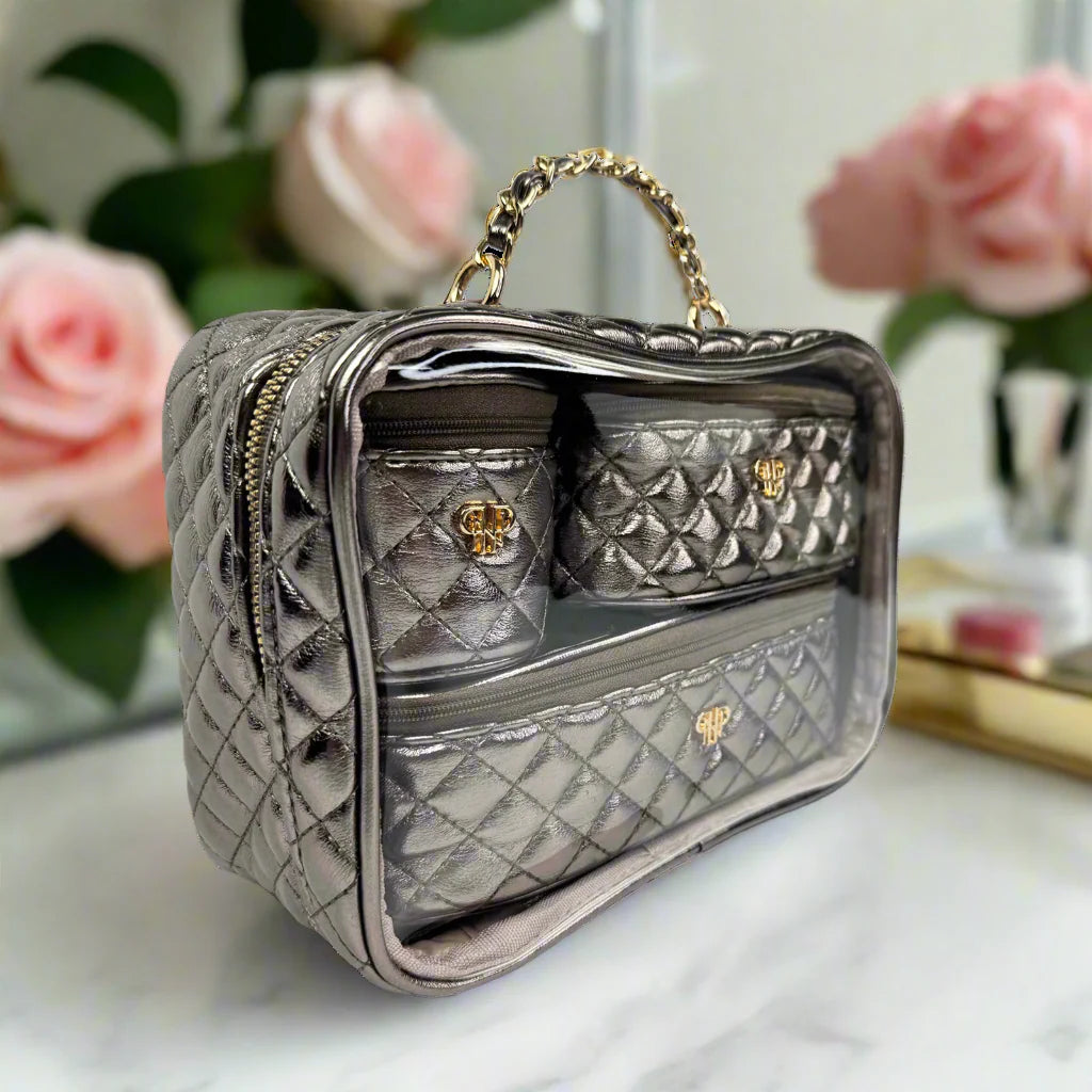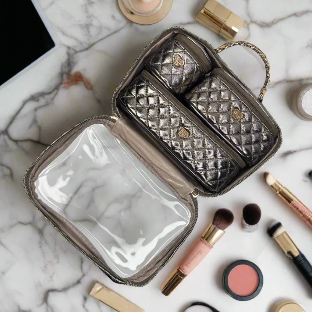 The Trio Jet Setter is your four-in-one answer to beauty on the go - elegant, organized, and effortlessly chic. The chic Bronze takes sophisticated to a whole new level. Inside the clear, structured case with designer inspired chain handle are three removable companion cases (extra small, small, and medium), perfectly sized to keep your makeup, skincare, and everyday essentials in flawless order. Whether you're heading to the office, the gym, or a weekend escape, the Trio Jet Setter keeps everything in place - and your routine looking fabulous every step of the way.
