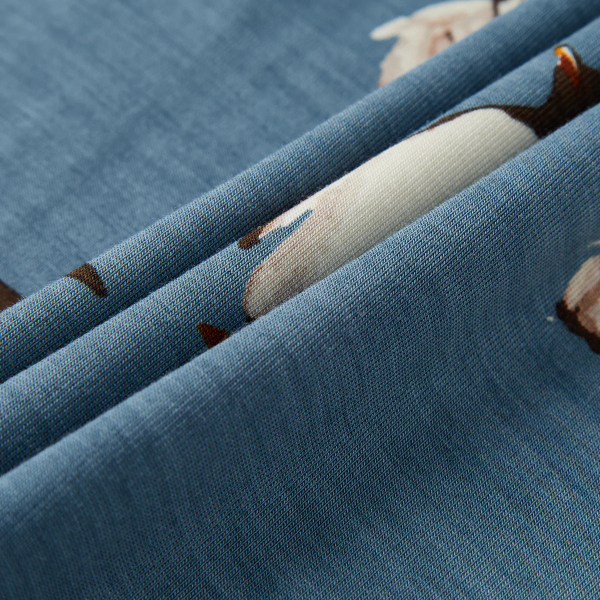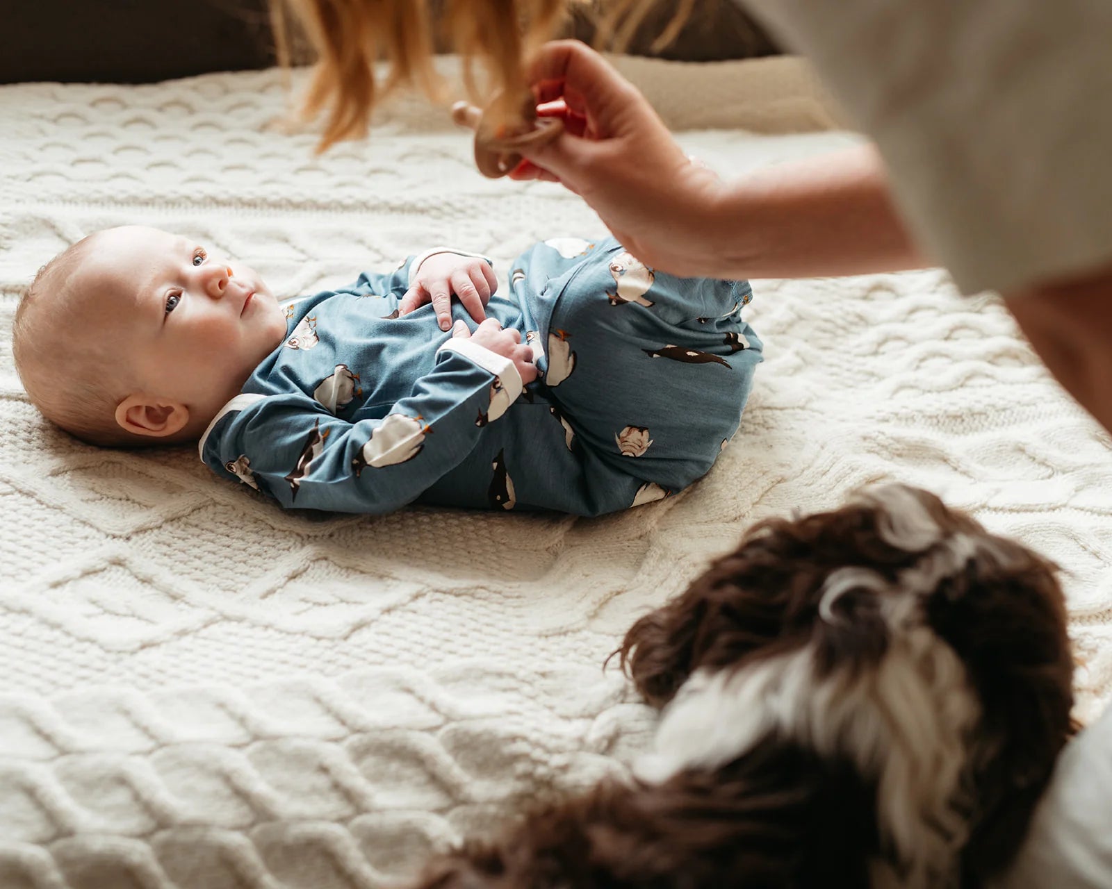 From that first emotional trip home to the initial months of bonding in the rocking chair, we highlight the beauty of your bundle of joy in our cozy, newborn Luxe Stretch Gown & Hat Set in the Penguin print. The coordinating knotted hat adds warmth, the fold-over hand covers provide added protection, and the soft elastic bottom and envelope neckline allow for ease of changing. Pair our Gown & Hat set with our coordinating Swaddle blanket or Burp Cloths for that perfect ensemble.