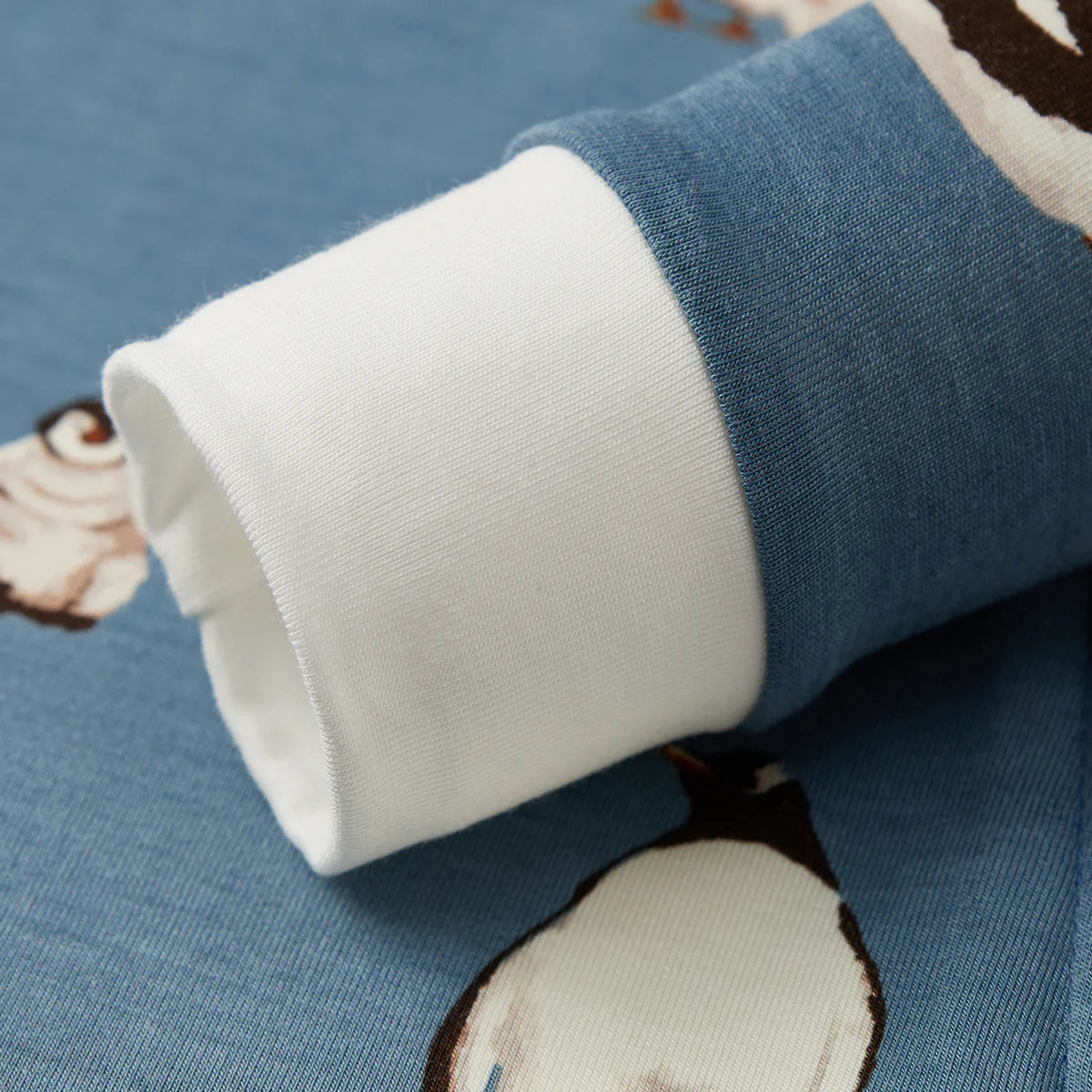Our extra soft Luxe Stretch Zipper Pajama in the Goose print blurs the lines between sleepy time, playtime, and cuddle time. The open foot detail allows your little ones greater mobility, while the midline, neck-to-knee zipper provides ease and flexibility of changing. Added details include a crew neckline, contrasting wide-band cuffs, and a stylized fabric zipper tab cover.
