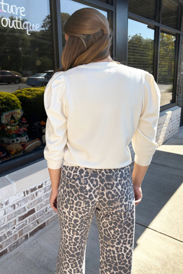This knit sweater offers a timeless style with its classic design. It features a crew neck accented by ribbed trim and long puff sleeves finished with ribbed cuffs for a charming touch. The ribbed high-low hem includes side slits for added movement and comfort. Please note, this sweater is unlined, making it perfect for layering or wearing on its own.