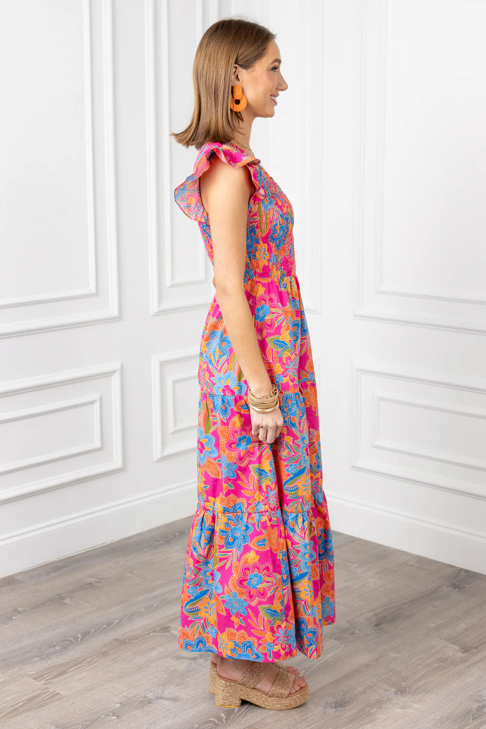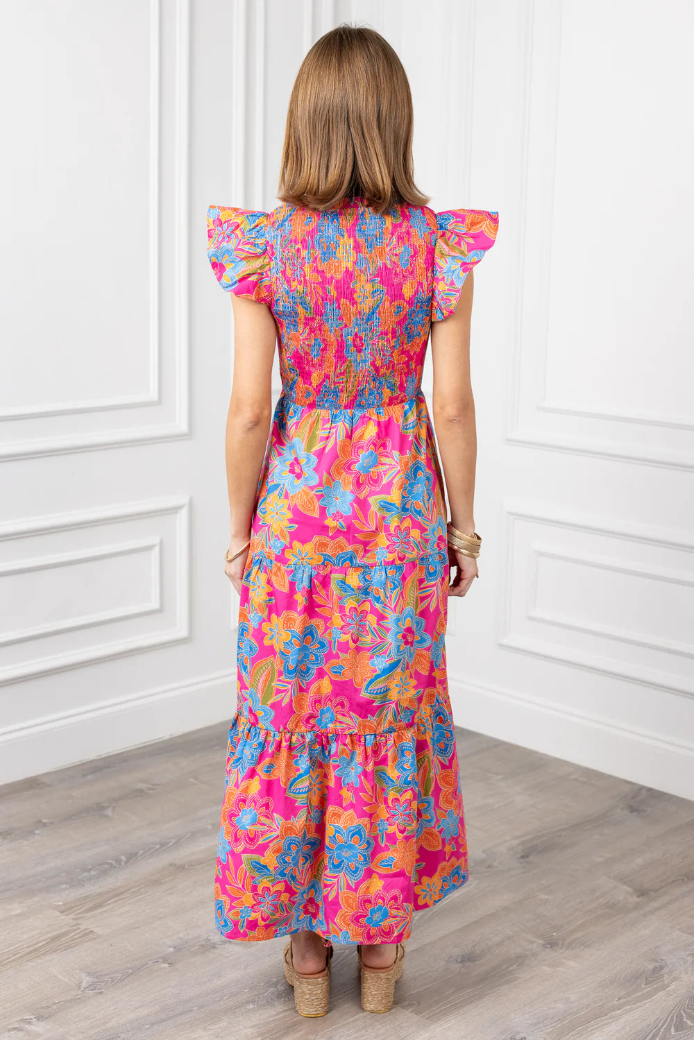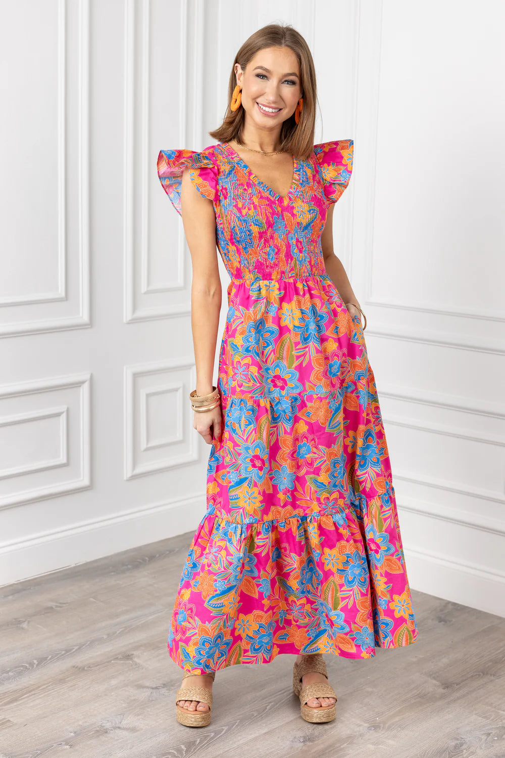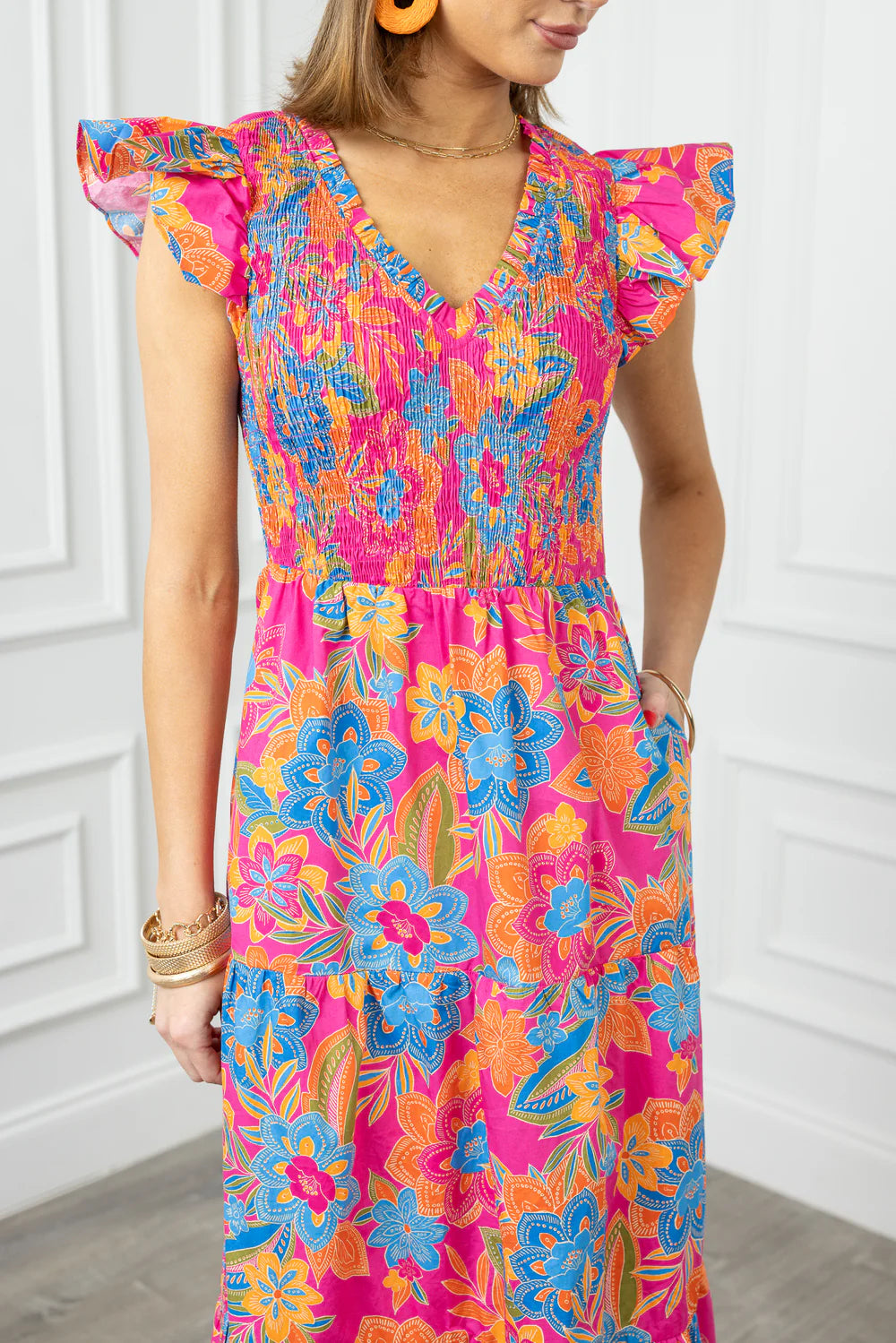 Get ready to feel flirty and fabulous in our Ranchero Floral Sunfire Midi Dress! This dress is sure to turn heads on your next vacay, with its vibrant floral print, smocked bodice, flutter sleeves, and convenient pockets. It's the perfect combination of style and comfort, and pairs perfectly with some neutral wedges. Don't forget to pack it for your upcoming trip and any other social events on your calendar.