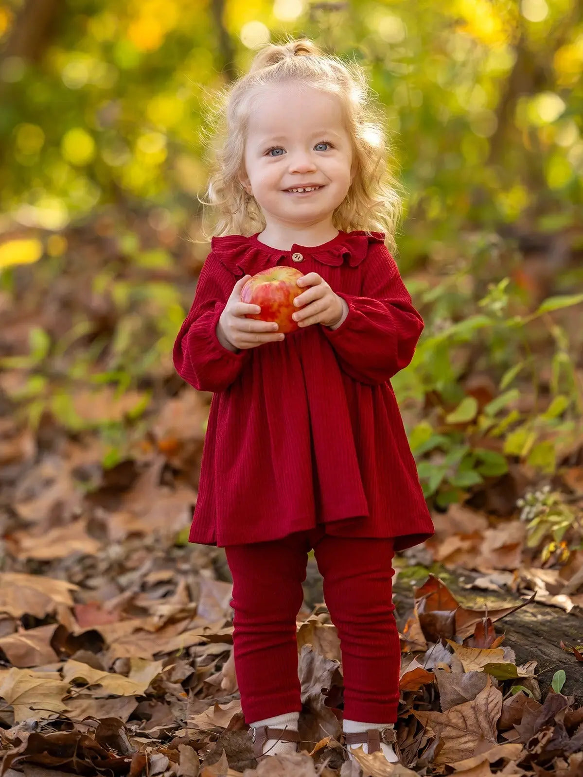 The Rosie two piece set is the epitome of comfort and style for your little one. This delightful set features a long-sleeved top with a sweet ruffled collar and button details, paired with matching ribbed leggings for a cozy coordinated look. Its deep red hue adds warmth and elegance, making it a standout addition to your baby’s wardrobe. Effortless and adorable!