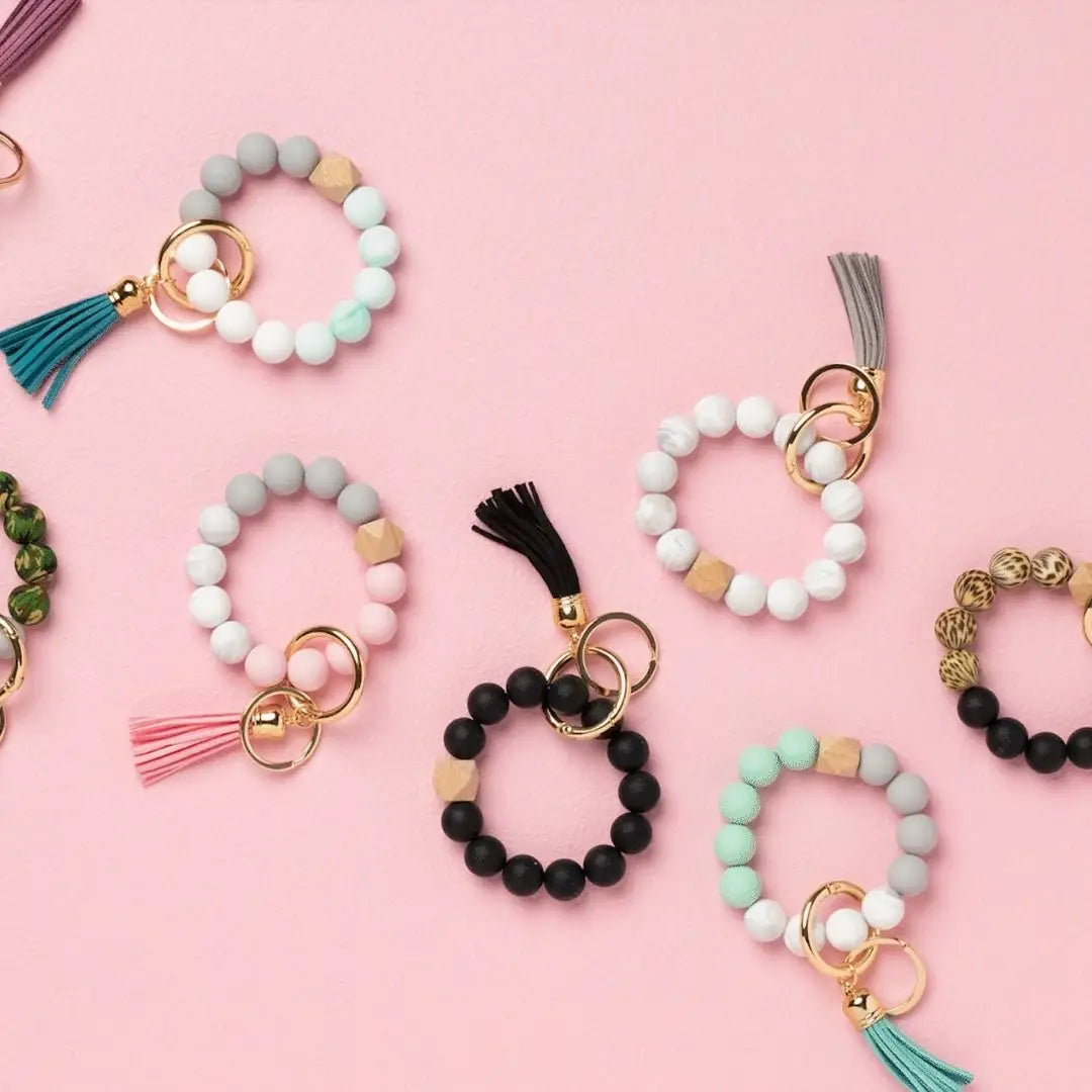 This silicone beaded key ring keychain is approximately 7" diameter.