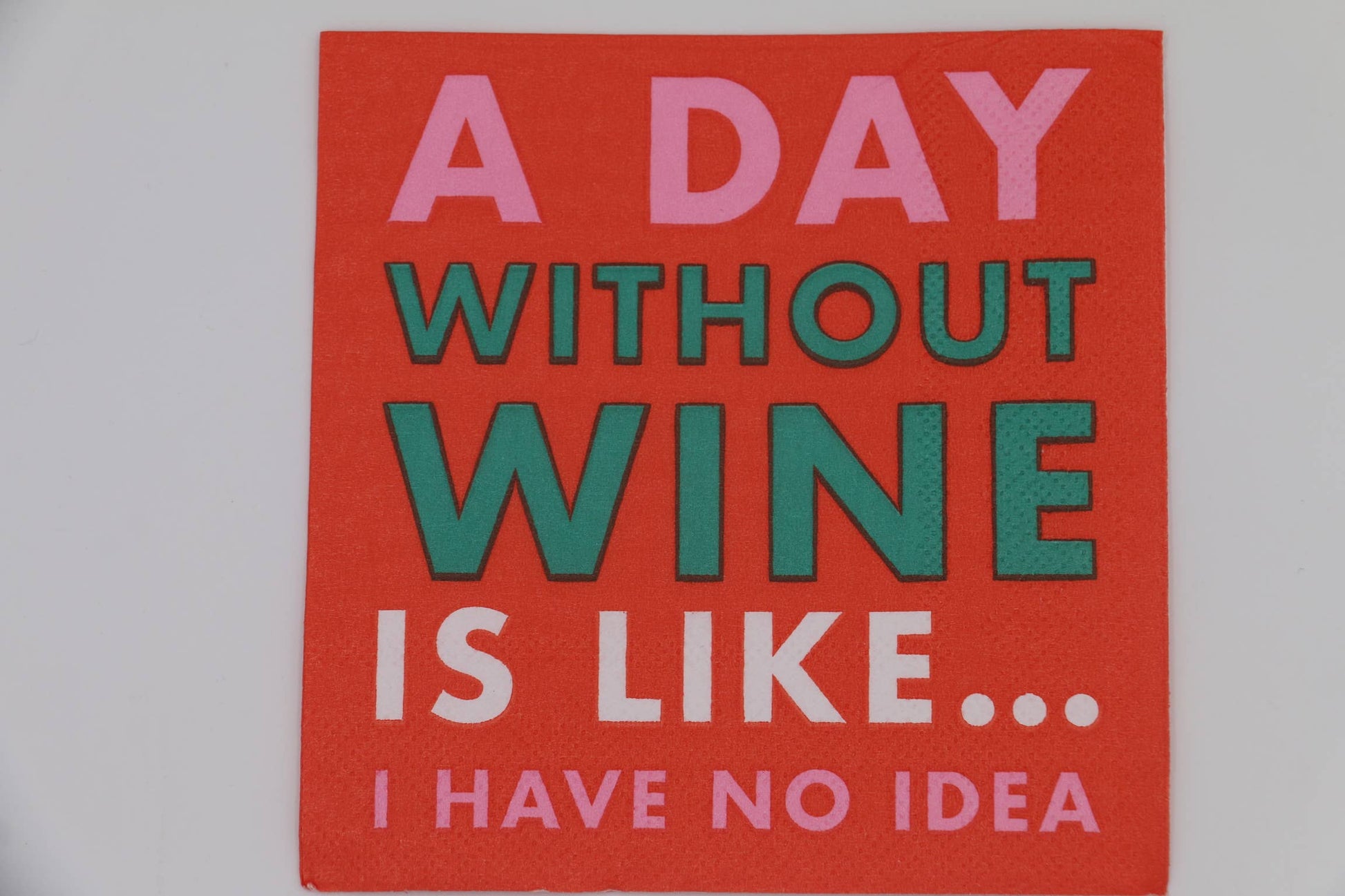 A Day Without Wine is Like...I Have No Idea These humor themed paper cocktail napkins are perfect for tabletop decoration and let your guests use them with convenience. These party napkins are soft and absorbent that helps in cleaning stains and spills with great ease. You can use these paper napkins for any gathering or party. The fun design on the napkins makes them a fit for any occasion. Great gift for any wine loving hostess, friend, family member or co worker.