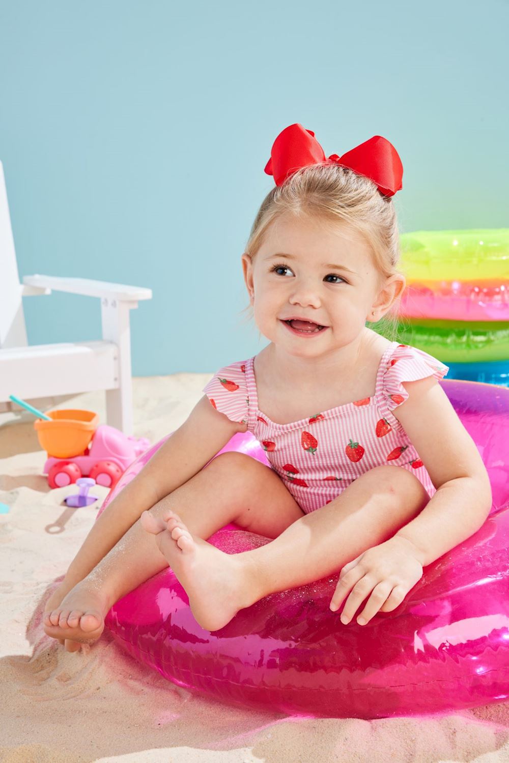 Girls' Strawberry Print Swimsuit is a delightful and charming swimwear option for young girls, featuring a playful strawberry print that adds a touch of fun to any beach or pool day. Crafted from a high-quality nylon spandex seersucker fabric, this swimsuit offers a comfortable and flexible fit, allowing for ease of movement. The flutter straps add a whimsical and stylish detail, while the back bow enhances the overall cute and girly aesthetic. Designed with practicality in mind, the swimsuit includes inner leg snaps for sizes up to 2T, making diaper changes quick and convenient. This swimsuit is UPF 50+ and composed of a blend of 50% polyester, 45% nylon, and 5% spandex, ensuring durability and a soft feel against the skin. Perfect for little ones who love to splash and play, this swimsuit combines style, comfort, and functionality.