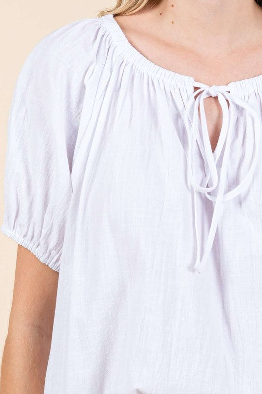 This versatile top can be styled two ways: as a round neck or off shoulder! The elastic neckline features a functional tie, and the puff short sleeve has an elastic opening. The elastic tunnel on the hem adds a cute touch!